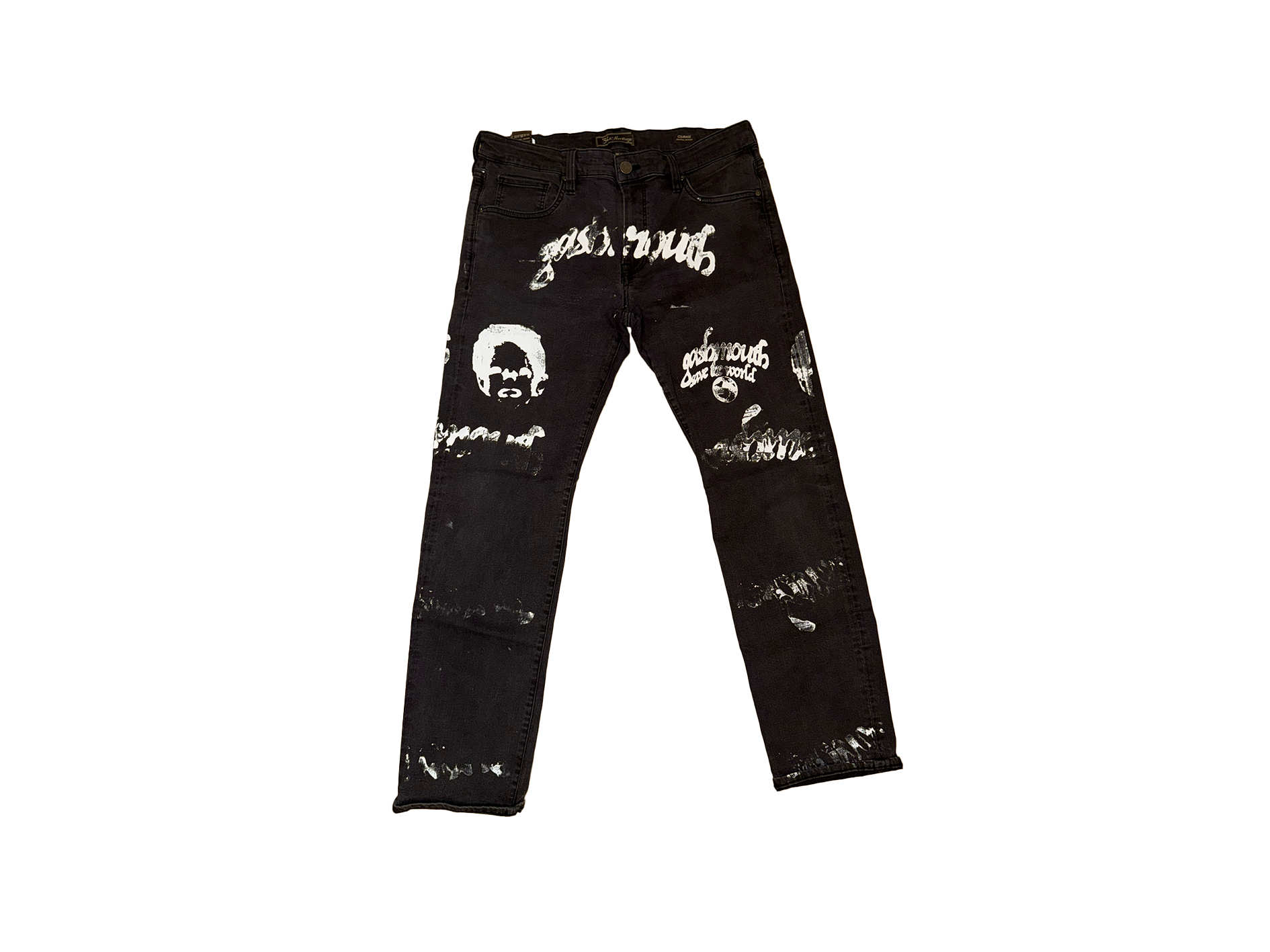 These Jeans were hand printed as part of the Save The World 333 collection, which helps combat the horrible damages caused by the fashion industry each piece is 1/1 hand made in house, helping save the world they were handpicked threw countless hours of thrifting this piece specifically is 36x32 34 & heritage Jeans that has been reinvisioned... don't forget there ONE OF ONE!